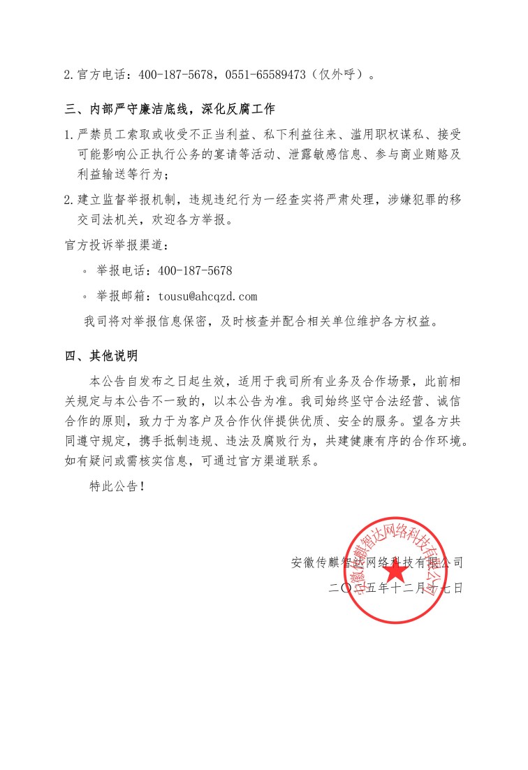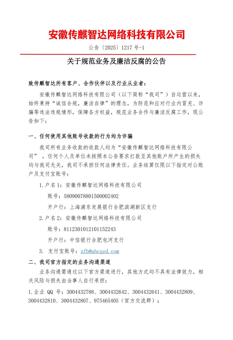 安徽传麒智达网络科技有限公司(以下简称“我司”)自运营以来,始终秉持“诚信合规,廉洁自律”的理念,为防范和应对行业内冒充、诈骗等违法违规情形,保障各方权益,规范业务合作与廉洁反腐工作,现公告如下: