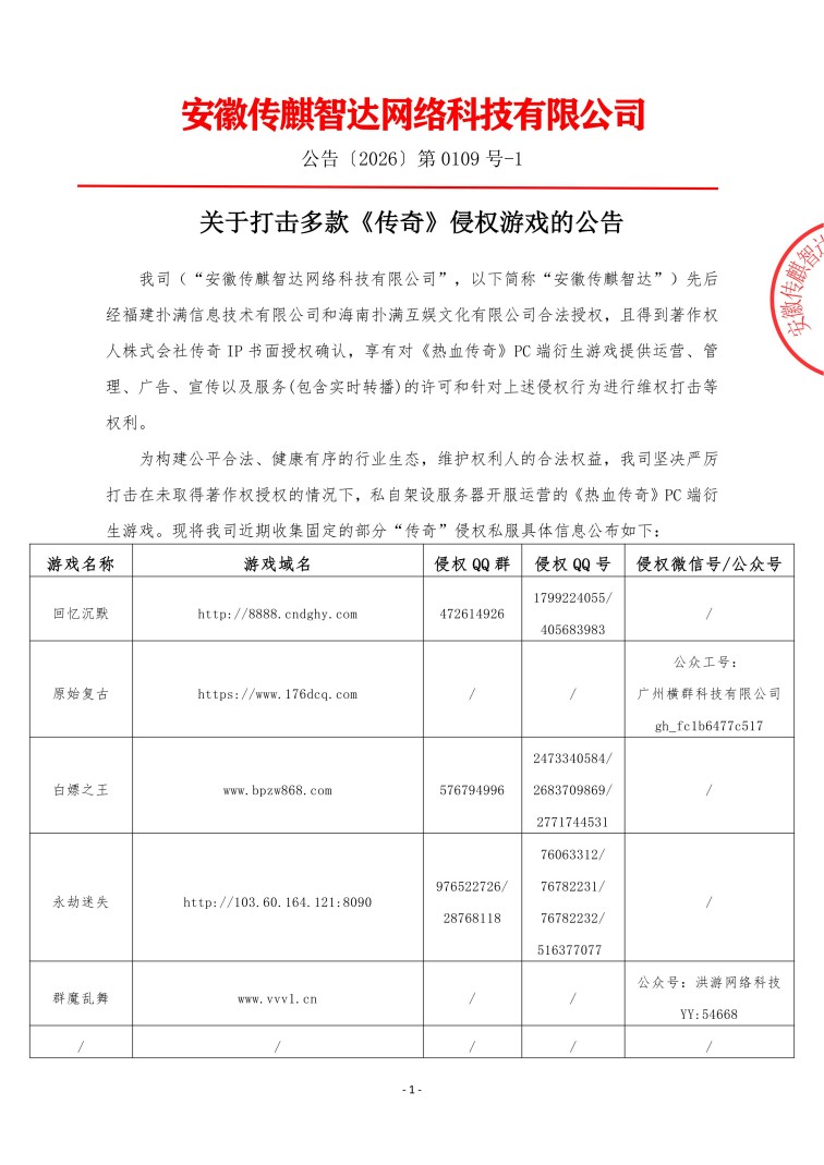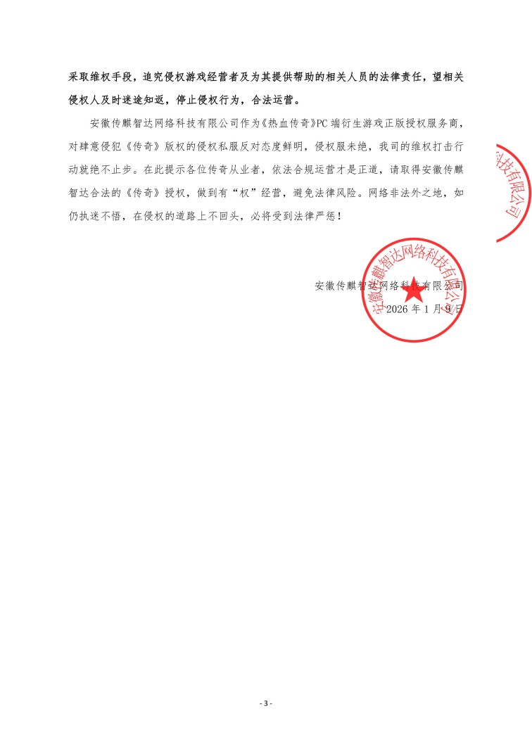 安徽传麒智达作为《热血传奇》PC端衍生游戏正版授权服务商,对肆意侵犯《传奇》版权的侵权私服反对态度鲜明,侵权服未绝,我司的维权打击行动就绝不止步。在此提示各位传奇从业者,依法合规运营才是正道,请取得安徽传麒智达合法《传奇》授权,做到有“权”经营,避免法律风险。网络非法外之地,如仍执迷不悟,在侵权的道路上不回头,必将受到法律严惩!