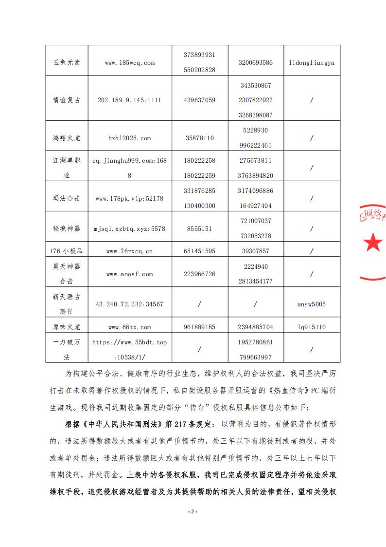 为构建公平合法、健康有序的行业生态,维护权利人的合法权益,我司坚决严厉打击在未取得著作权授权的情况下,私自架设服务器开服运营的《热血传奇》PC端衍生游戏。现将我司近期收集固定的部分“传奇”侵权私服具体信息公布如下: