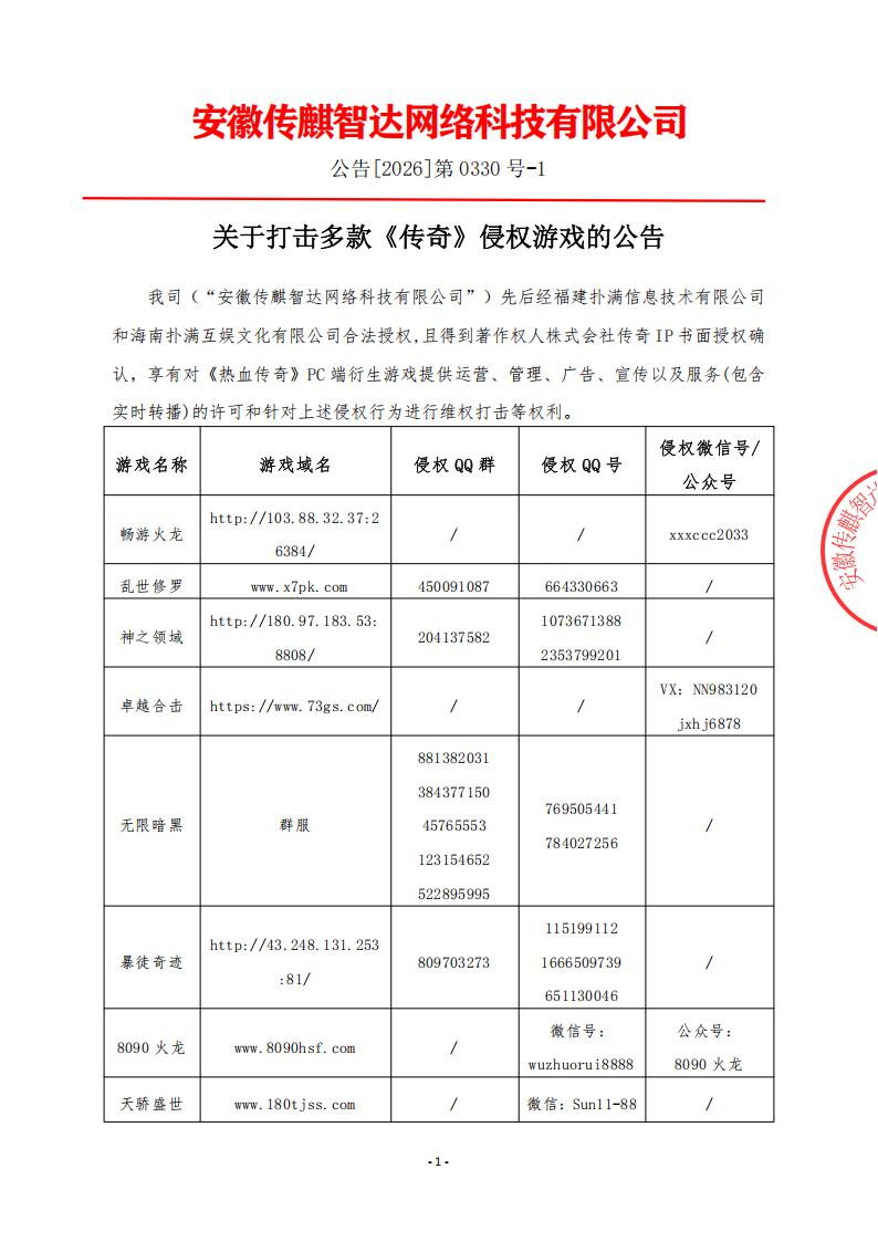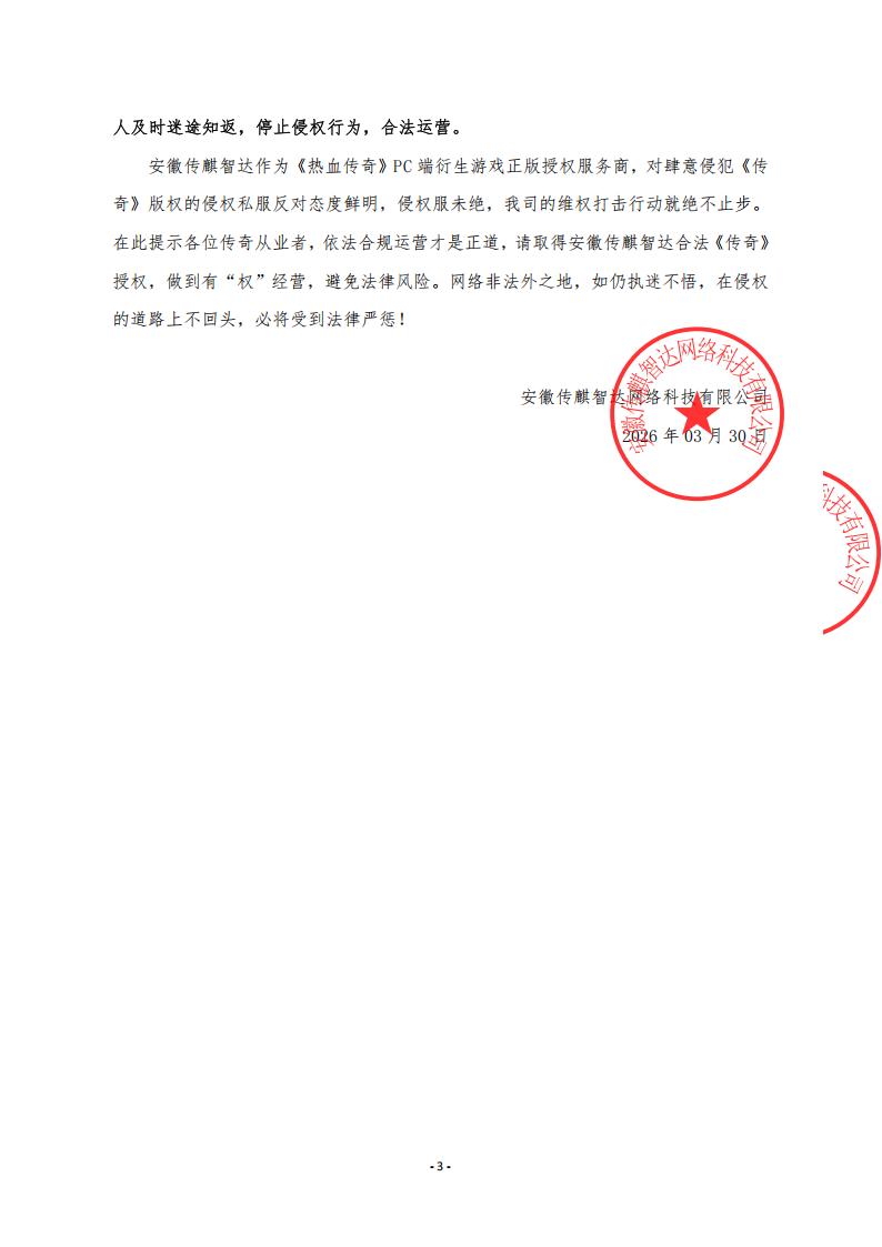 安徽传麒智达作为《热血传奇》PC端衍生游戏正版授权服务商,对肆意侵犯《传奇》版权的侵权私服反对态度鲜明,侵权服未绝,我司的维权打击行动就绝不止步。在此提示各位传奇从业者,依法合规运营才是正道,请取得安徽传麒智达合法《传奇》授权,做到有“权”经营,避免法律风险。网络非法外之地,如仍执迷不悟,在侵权的道路上不回头,必将受到法律严惩!